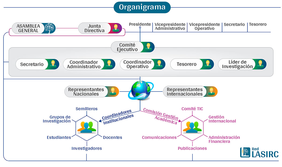El organigrama de RED LASIRC refleja una estructura organizacional robusta, multidimensional y adaptada a las exigencias de una red académica y científica internacional. Esta configuración jerárquica y funcional permite articular eficientemente los distintos niveles de gestión, investigación y colaboración interinstitucional, tanto a nivel nacional como internacional.